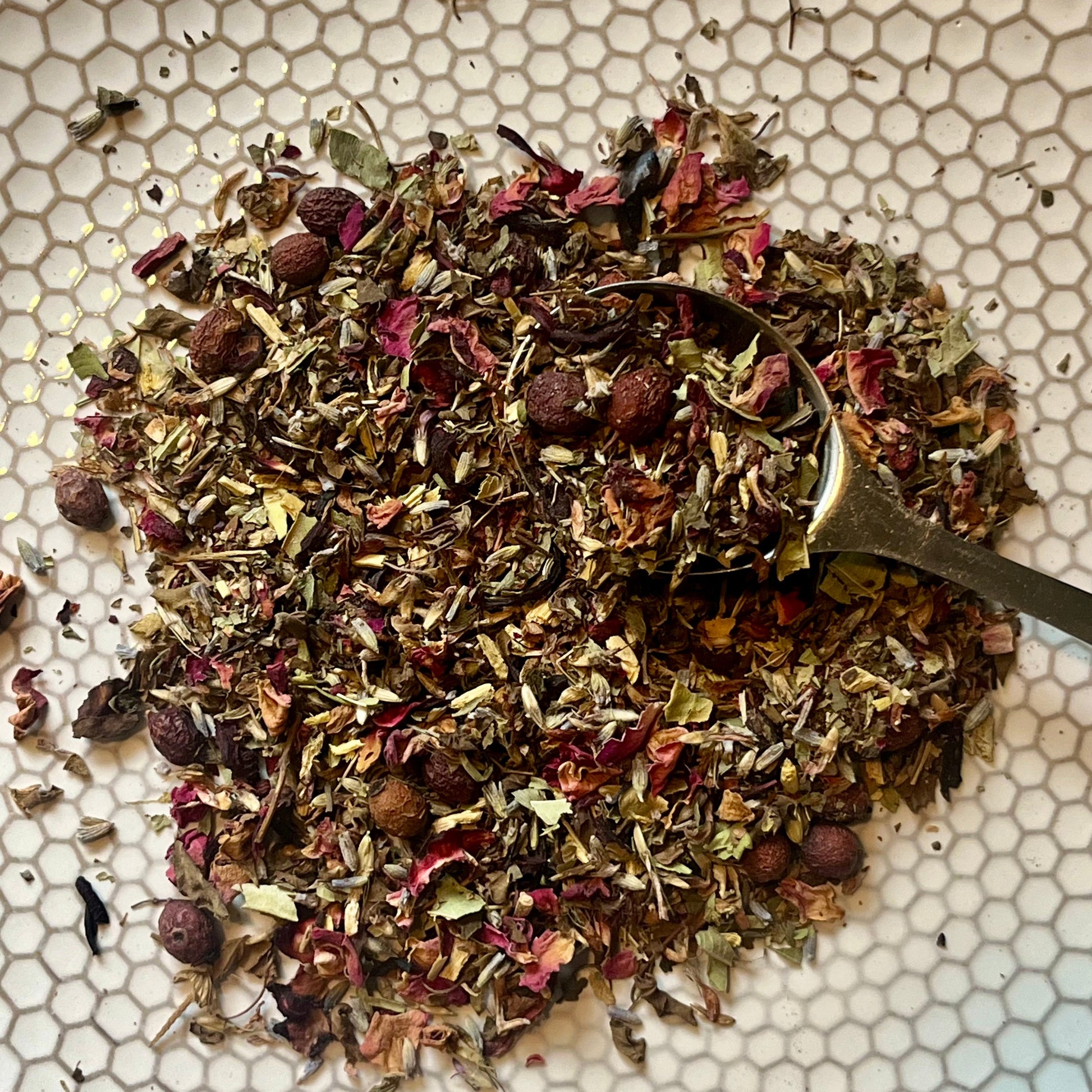 All Organic Ingredients: red clover, lemon verbena, hawthorne berries, hibiscus, holy basil, rose & lavender