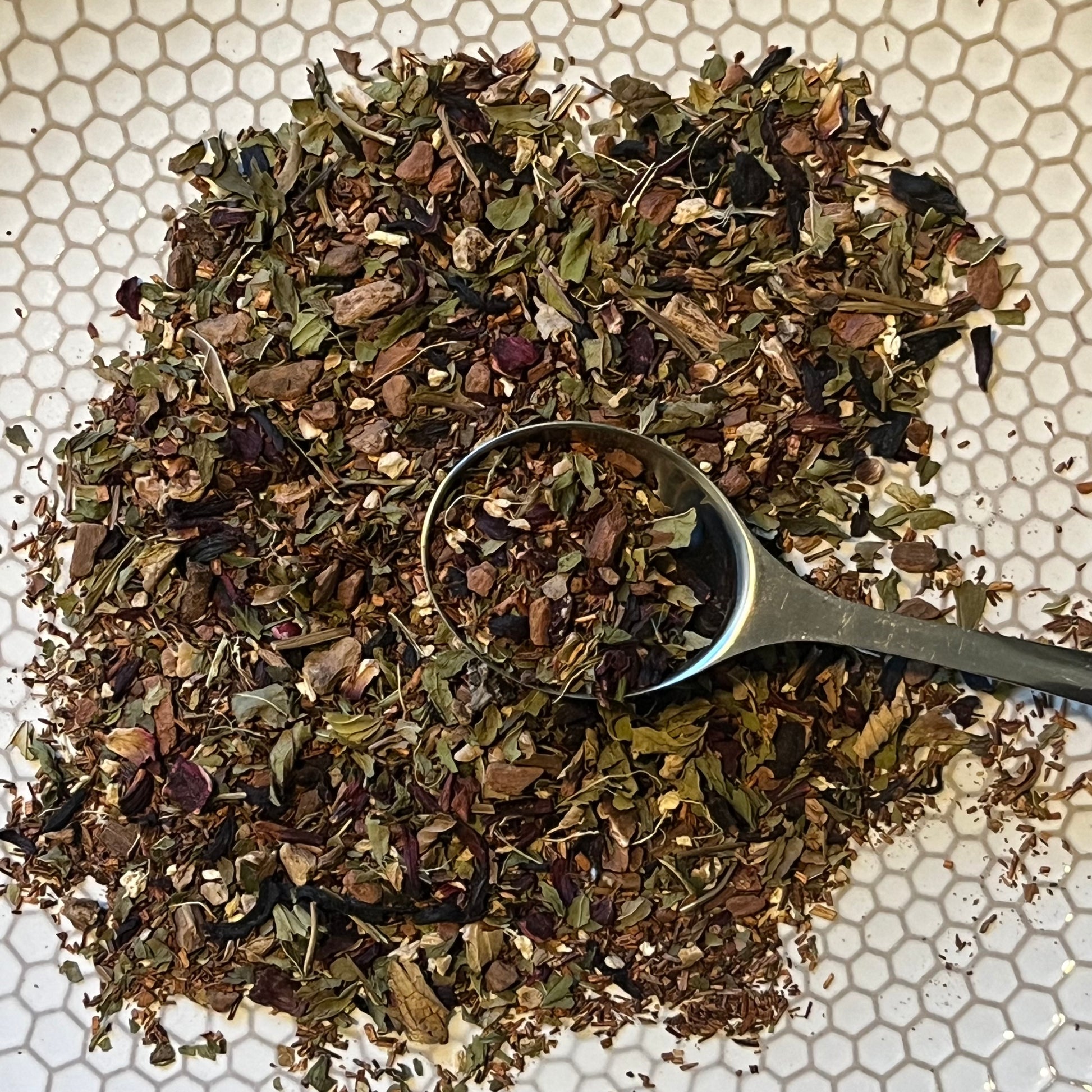 Ingredients: rooibos, cinnamon chips, hibiscus, peppermint, sarsaparilla, clove, ginger and vanilla bean